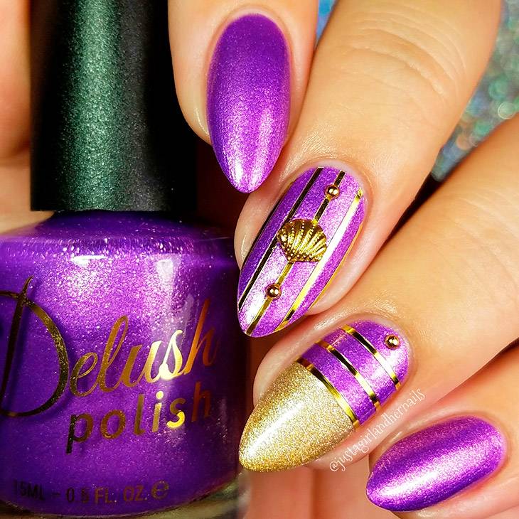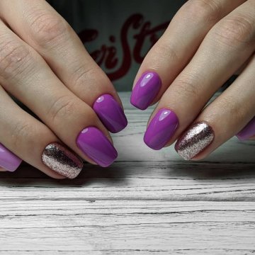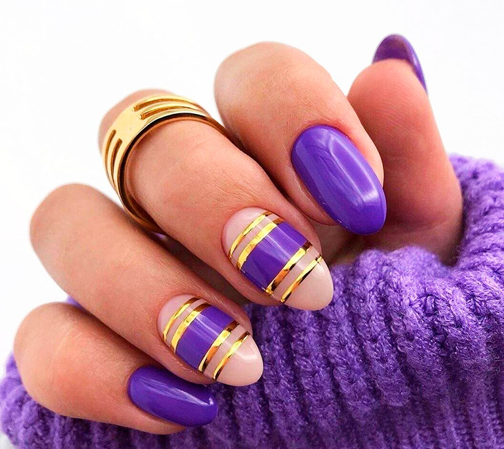 Фиолетовый и золотой цвет создают роскошное и элегантное сочетание. Вы можете использовать золотистые акценты, например, золотистые блестки или линии, чтобы добавить шик и блик к фиолетовому маникюру.