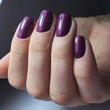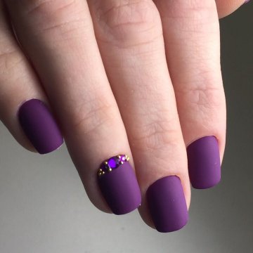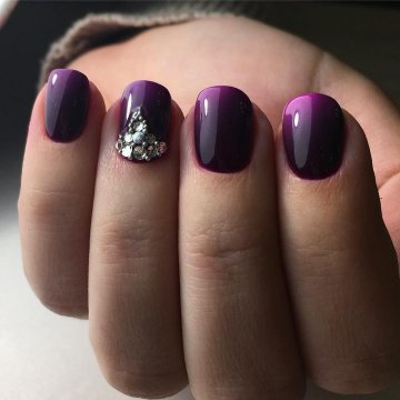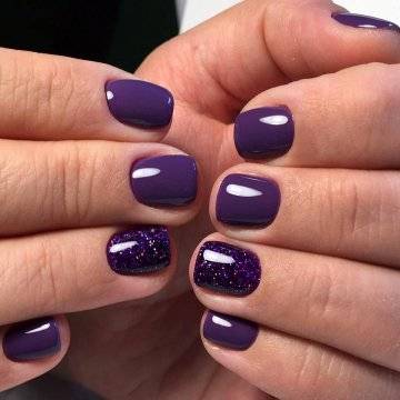На коротких ногтях красиво смотрятся классические одноцветные маникюры в оттенках индиго, пурпурный, лавандовый, серо-фиолетовый баклажановый и аметистовый. А также он хорошо может сочетаться с нежными нюдовыми оттенками, делая образ более элегантным и шикарным.