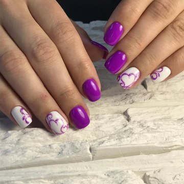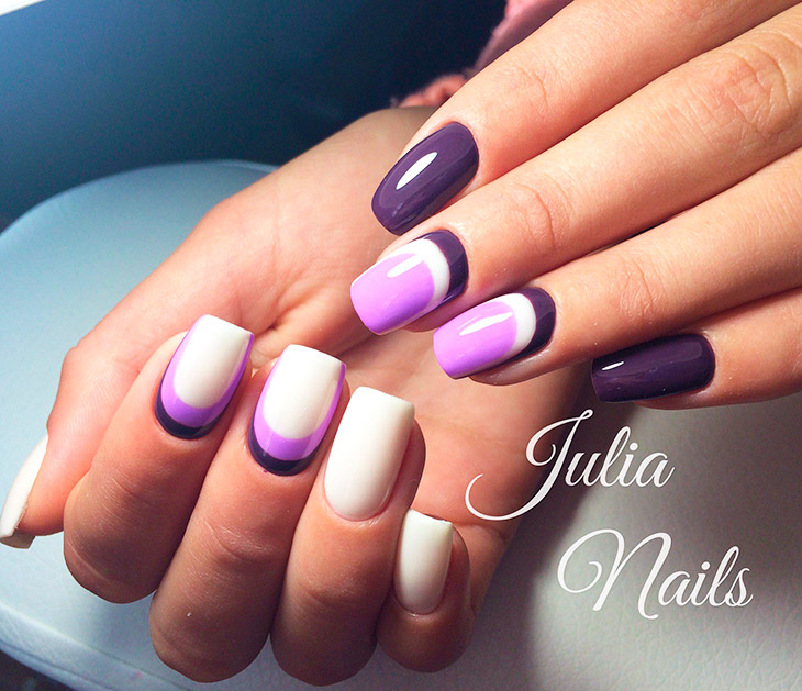 Белый и фиолетовый дружат, так как оба цвета — одинаково броские. Маникюр с таким сочетанием цветов получается удачным. Лучше всего использовать эту цветовую комбинацию в графичном дизайне. Самый простой вариант — сделать фиолетовый фоновым цветом, а белым закрасить лунку ногтя. Но есть и другие способы, как на фото ниже.