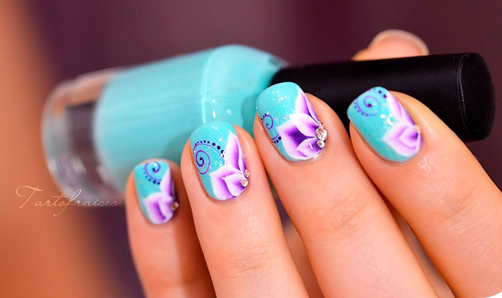 Сиреневый в комбинации с бирюзовым представляет собой яркий, праздничный вариант маникюра. Как правило, этот цвет используют либо в качестве декоративных элементов (в основном, стразах и блестках), либо для плавного перехода из одного оттенка в другой. При сочетании светло-фиолетового с бирюзовым лучше использовать глянцевые лаки.