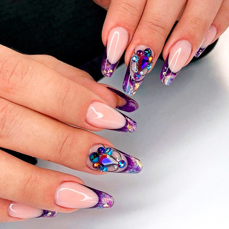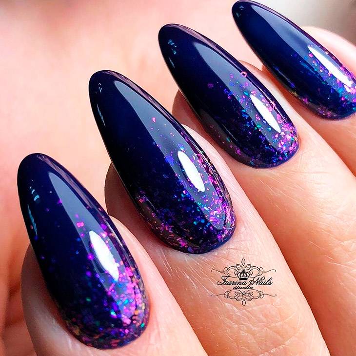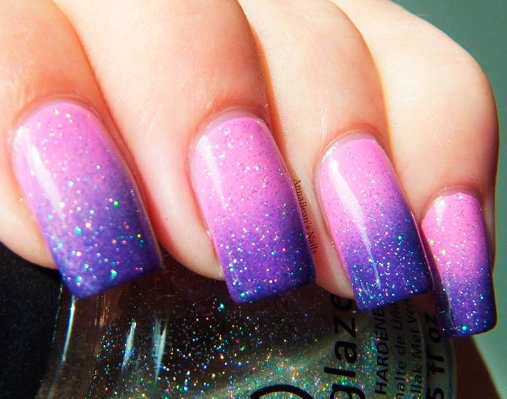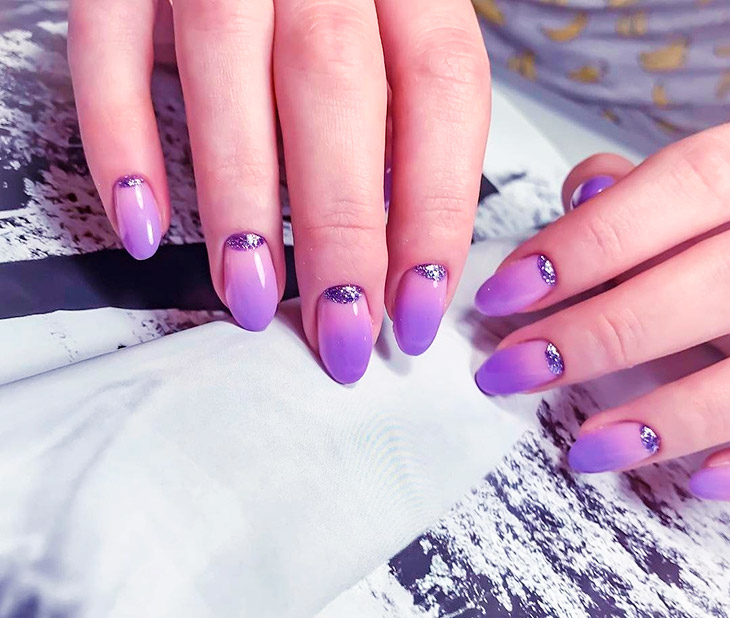 Омбре отлично сочетается с разнообразными блестками. Прозрачный фиолетовый с блестками поможет создать имитацию звездного неба. Эффект космоса и ночного неба достигается за счет фиолетовых переходов.