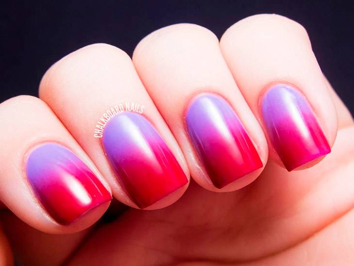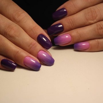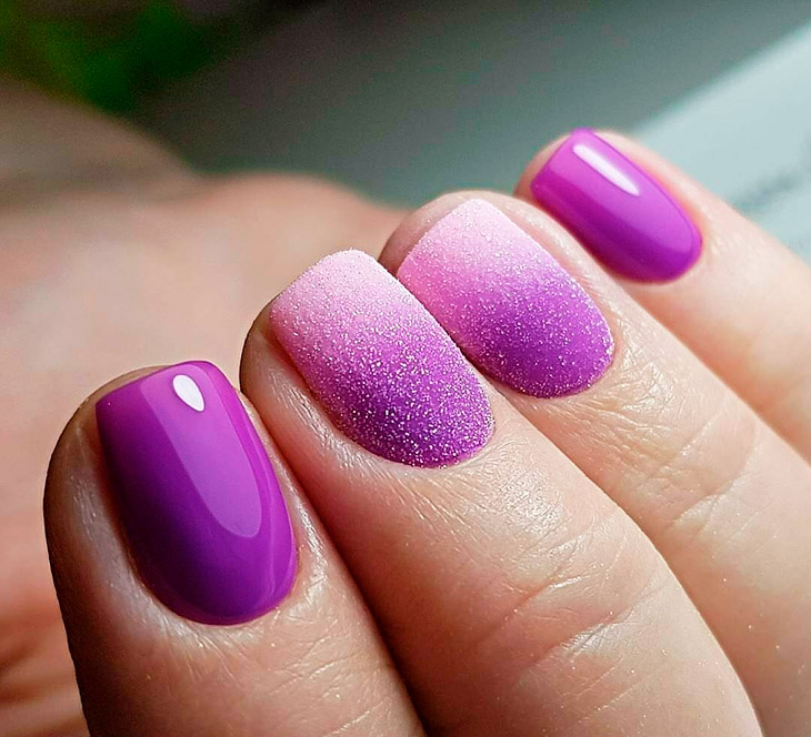 Омбре на ногтях отдают предпочтение сильные независимые творческие женщины. Техника плавного перехода оттенков от фиолетового к сиреневому не всегда дает необходимый результат. Улучшить эффект поможет нанесение втирки, с которой идеально сочетается любой оттенок. Такой нейл- арт смотрится модно и ярко, способствует созданию красочного образа.