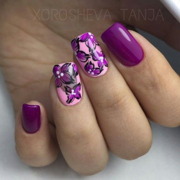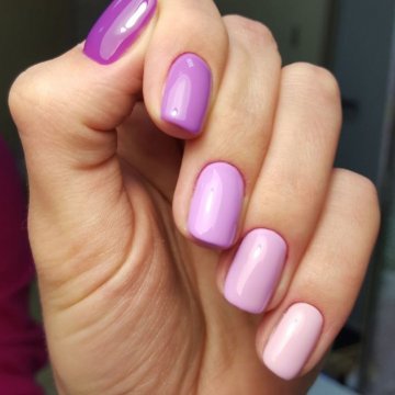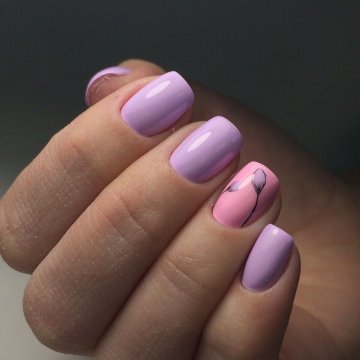 Со светло-фиолетовым хорошо сочетаются нежные, пастельные тона розового. Более насыщенные оттенки подойдут для ярко- или темно-сиреневого маникюра. Розовый широко используют при создании градиента, нанесении цветочных рисунков.