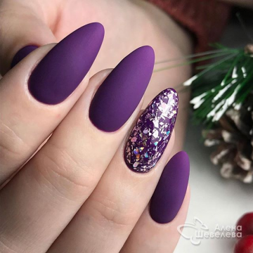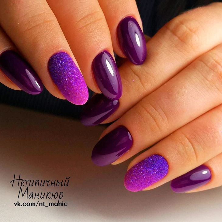 Гель-лак и шеллак позволяет сделать уникальные варианты дизайна с фиолетовым цветом. Он теплый и холодный одновременно, поэтому с ним хорошо смотрятся вязаные дизайны и тренды новогодних коллекции в нейл-арте.