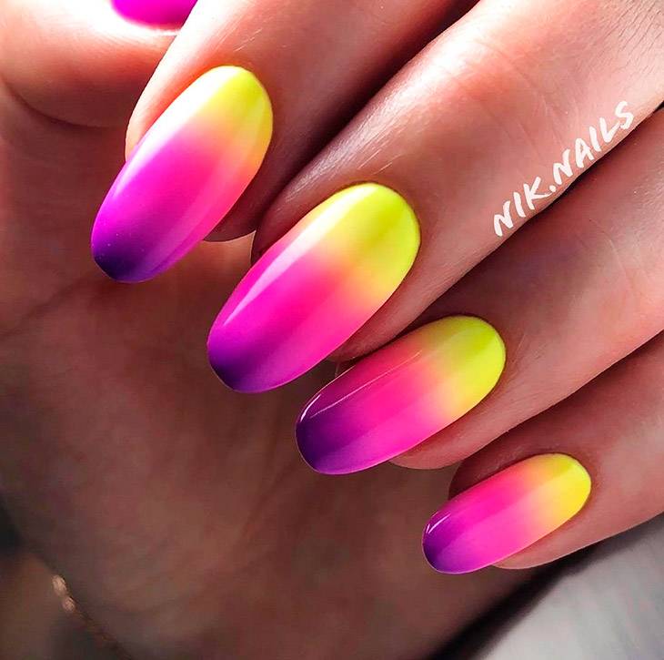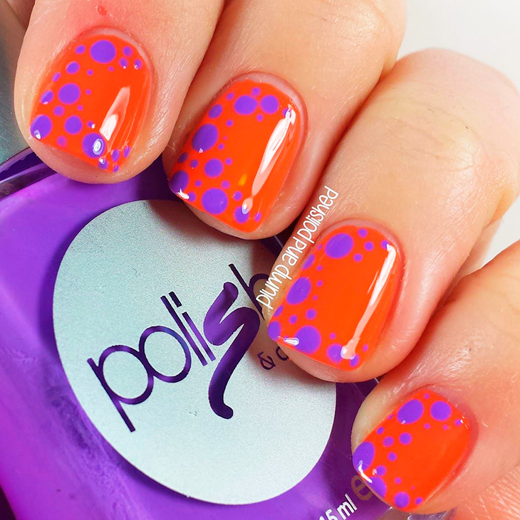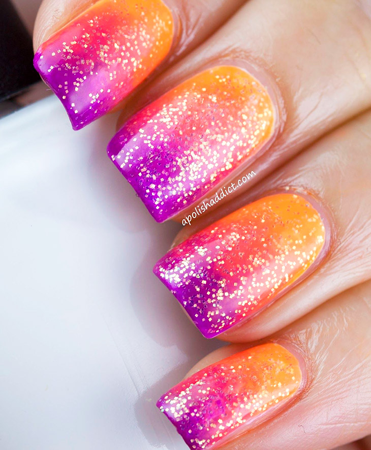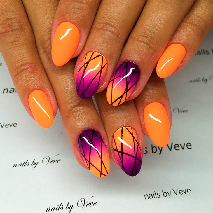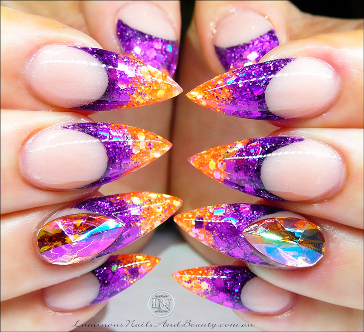 Сочетание сиреневого с оранжевым не является особо распространенным, но подобная комбинация возможна. Часто их используют с целью создания яркого глянцевого омбре. Допустимо поочередное нанесение двух оттенков, использование небольшого количества блесток.