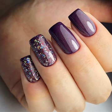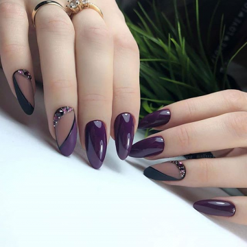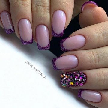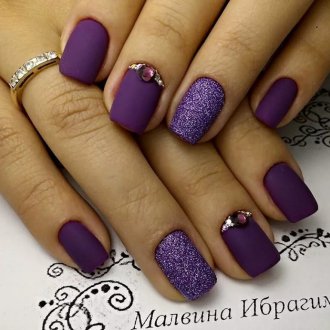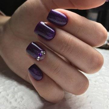 Для создания вечернего образа, сочетаемого с нарядом, фиолетовый маникюр будет замечательным вариантом, а украшая его стразами и блестками можно создать праздничный и поистине волшебный и стильный маникюр 2021-2022.