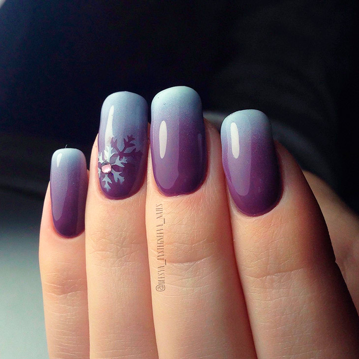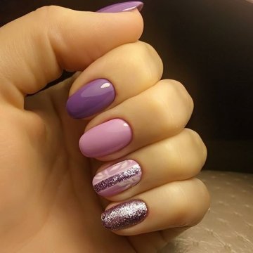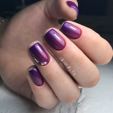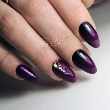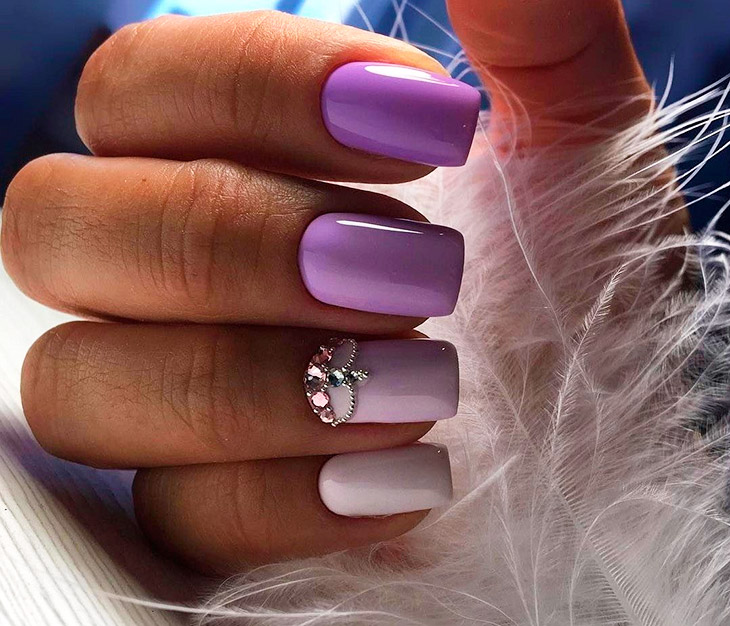 Сиреневый как один из вариантов фиолетового хорошо сочетается с его более темными тонами. Особенно хорошо маникюр выглядит в виде градиента – в рамках каждой отдельной пластины или путем последовательного окрашивания ногтей в разные оттенки. Сиренево-фиолетовый дизайн дополняют блестками и стразами.