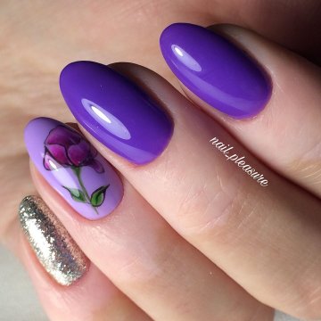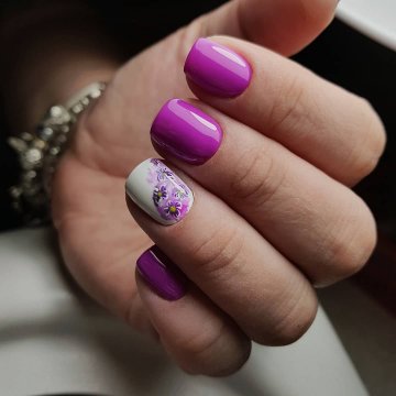 Рисунками на темных оттенках фиолетового увлекаться специалисты не рекомендуют, можно использовать безымянным палец с белым фоном, а остальные ногти оставить фиолетовыми. Или же применять сиреневыми цвета для создания рисунков, цветочных композиций и рисования замысловатых узоров.