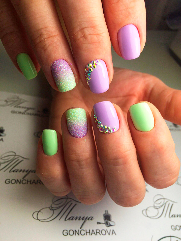 Сиреневый маникюр комбинируют преимущественно с пастельными тонами зеленого. Особенно популярен мятный оттенок, который используют для эффекта омбре. Темно-зеленый цвет необходимо наносить вместе с соответствующим сиреневым тоном. Украсить декор можно стразами и глиттером.