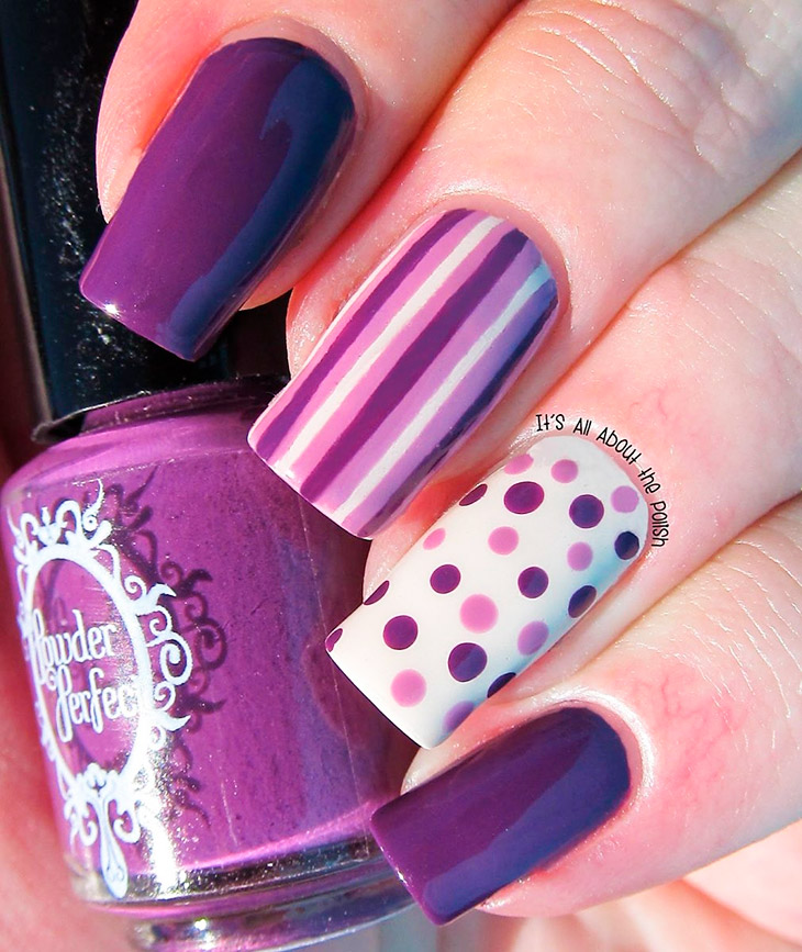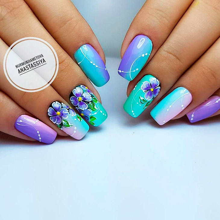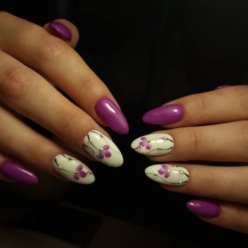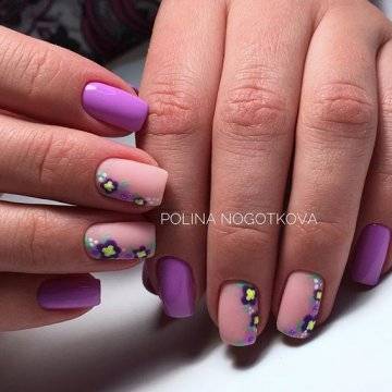 Тем, кто решил использовать сиреневый либо фиолетовый в нейл-арте в комбинации с другими цветами, нужно задуматься о подборе правильного сочетания. Оттенки должны либо гармонировать друг с другом, либо выразительно контрастировать. К лавандовому подходят в основном пастельные оттенки, а темный ежевичный можно сочетать с контрастными светлыми цветами — например, с белым.