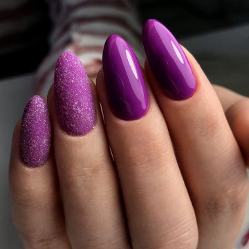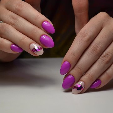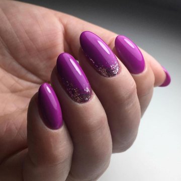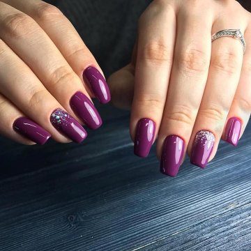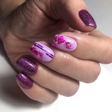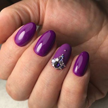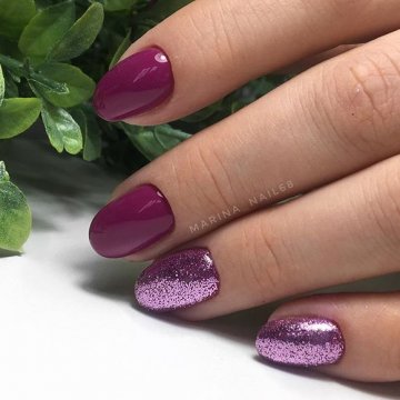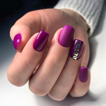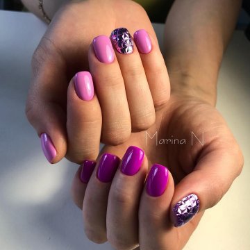 К малиновым оттенкам подходят насыщенные и темные тона сиреневого. Как правило, они используются для создания глянцевого маникюра и градиента. Украшают ногти обычно поталью, блестками и стразами для создания максимально яркого образа.