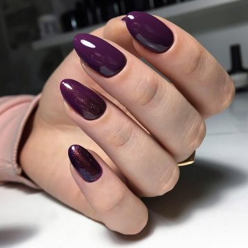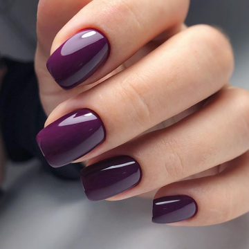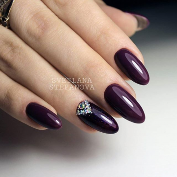 Аристократичность баклажанового цвета дает ему возможность выглядеть дорого и просто в однотонном состоянии, его можно использовать и для вечерних маникюров, и для повседневного образа «Леди на миллион».