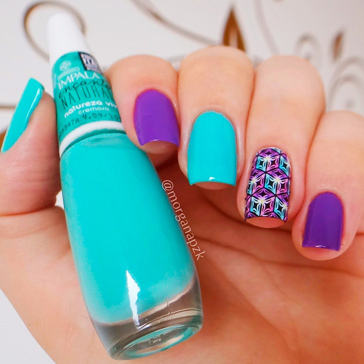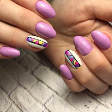 - Для модного нейла-арта комбинируют фиолетовые и мятные оттенки с негативным пространством. Для создания сложных геометрических узоров потребуются трафареты. Чаще всего, на поверхности рисуют россыпь треугольников или квадратов разной формы, каждый из которых окрашивают в хаотичном порядке;