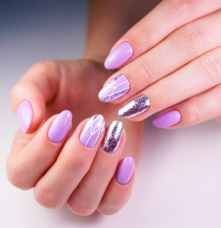 Сиреневый маникюр гармонирует с серыми тонами, особенно с серебристым. Чтобы создать подобную комбинацию, лучше всего использовать матовые лаки. Серебристый можно использовать в качестве декора: блесток, геометрического принта, полосок и фольги.