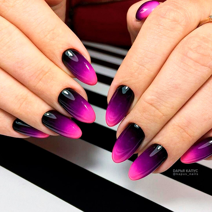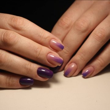 Трендом использования шеллака в этой гамме в 2021-2022 станет техника омбре, можно применять как вертикальную и горизонтальную растяжку, так и диагональную или даже круглую, изменяя цвет от темно-фиолетового к белому, или от розового к баклажановому.