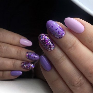 Сиреневый и лиловый являются родственными цветами и хорошо сочетаются друг с другом в рамках одного дизайна. Их применяют как в глянцевом, так и в матовом вариантах, дополняются блестками, цветочными или геометрическими принтами, фольгой. Цвета можно использовать для создания градиента.