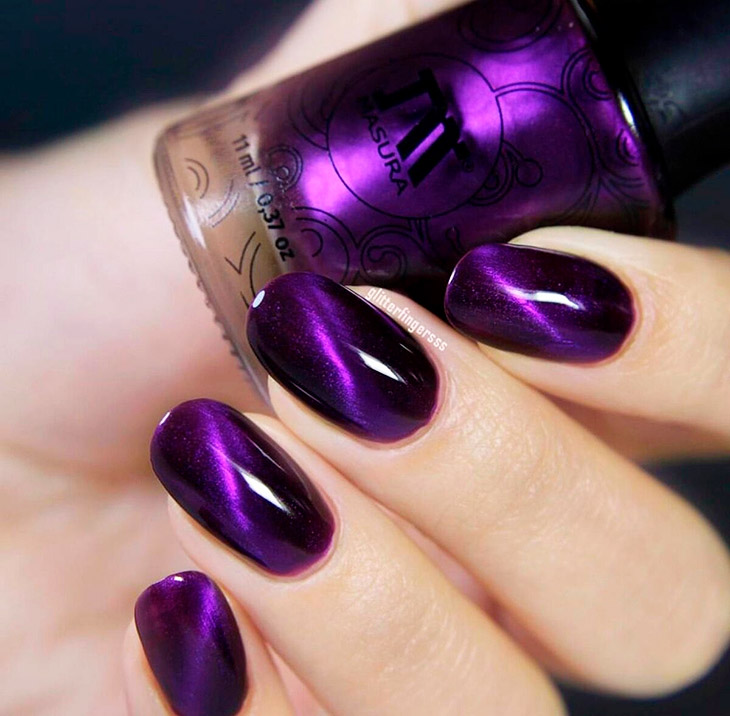 Нейл-арт в «кошачьем» стиле пользуется спросом на протяжении нескольких сезонов. Мягкие переливы лака образуют замысловатый узор при использовании магнитного покрытия. Матовая поверхность добавит образу мягкости. Выборочный декор ноготков стразами, бульонками, блестками поможет разнообразить маникюр.