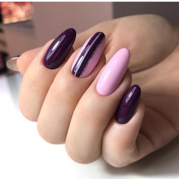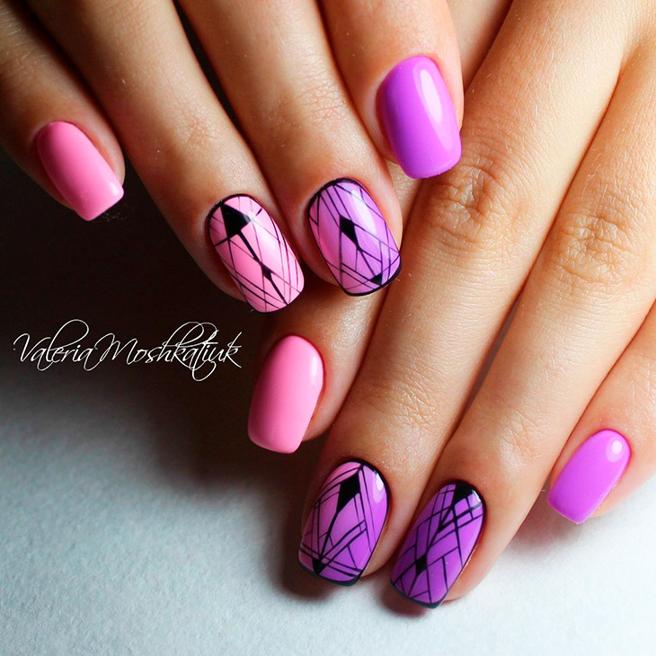 Фиолетовый и розовый образуют привлекательное сочетание, особенно для романтического или нежного маникюра. Вы можете использовать розовый цвет для акцентных ногтей или для создания узоров вместе с фиолетовыми оттенками.