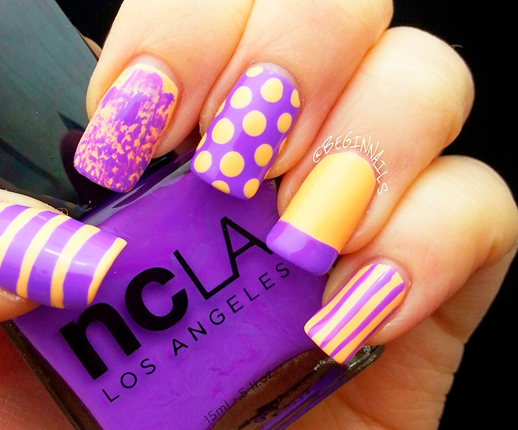 Фиолетовый и оранжевый цвет в маникюре создают эффектный контраст. Вы можете использовать оранжевый цвет для акцентных ногтей или для создания рисунков и узоров вместе с фиолетовыми оттенками, чтобы добавить теплоту и энергию к вашему маникюру.