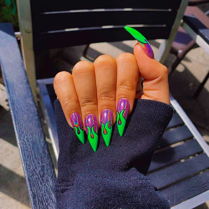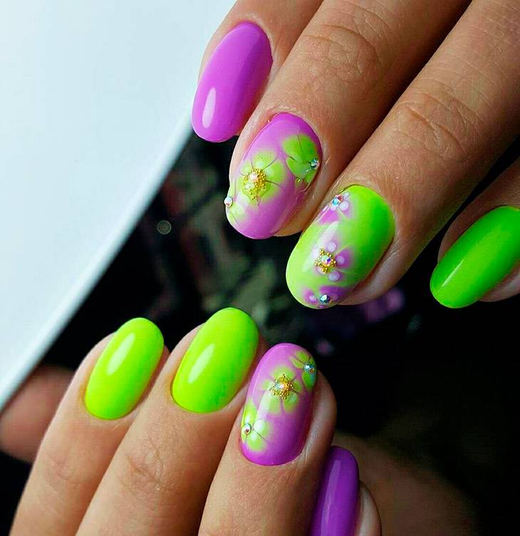 Фиолетовый и лаймовый (ярко-зеленый) цвет создают яркое и энергичное сочетание. Это сочетание идеально подходит для смелых и стильных маникюров. Вы можете использовать лаймовые акценты или создать контрастные узоры вместе с фиолетовыми оттенками.