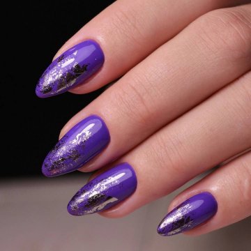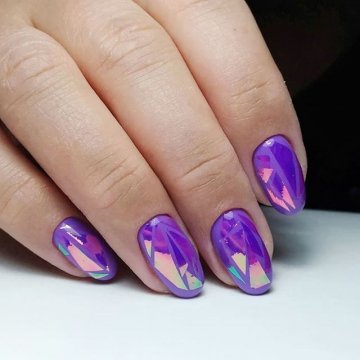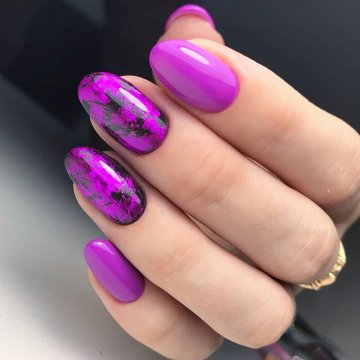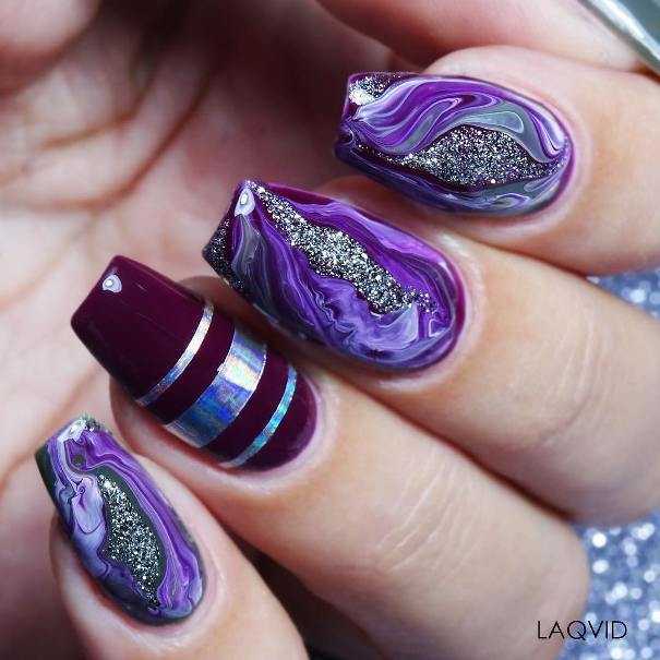 Для получения оригинального и необычного дизайна фиолетовых тонов лучше использовать техники с фольгой и блестящей втиркой, а также мраморные варианты.