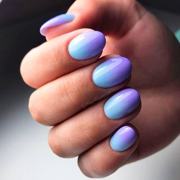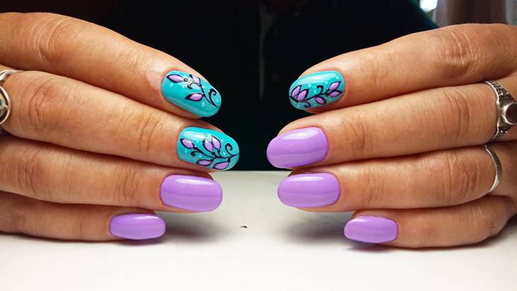 Нежные оттенки голубого маникюра хорошо сочетаются с сиреневым, могут использоваться для создания омбре. Украшением такого дизайна станет эффект мрамора на одном из ногтей, стразы или принты.