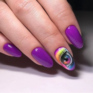 Если фиолетовый — с повышенной яркостью, сочетать его с другими цветами легко. Даже с такими самодостаточными, как красный, синий, зеленый, желтый, оранжевый. Фиолетовые ногти идеально дополнят образ для вечеринки.
