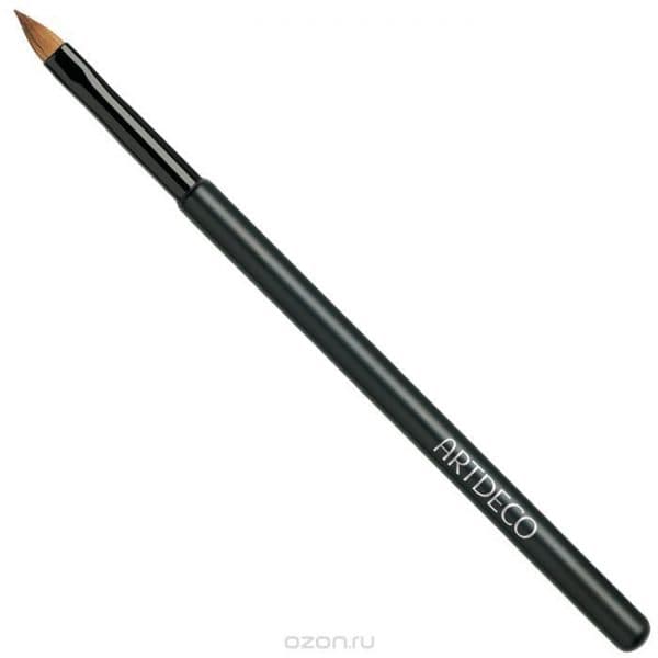 Кисть для губ имеет заостренную форму и выполняется только из синтетики. Ее вид всего лишь один, но в арсенале лучше держать 2-3 таких инструмента для разных цветовых решений. Различаются они лишь длинной ворса. Для жидких помад, блесков безупречно подойдет очень длинная кисть с острым концом. Для более плотных текстур короткая, приближенная к квадрату.