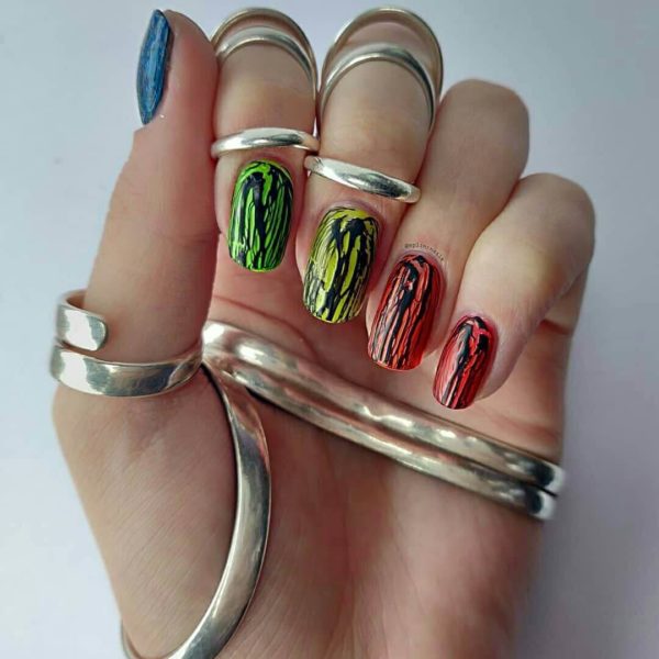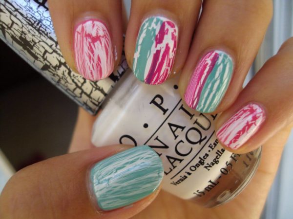 Для создания оригинального нейл дизайна стилисты советуют экспериментировать и вместо обычного вертикального нанесения покрытия «кракле» делать его горизонтальным, круговым, диагональным.