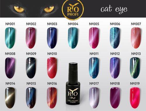 - Актуальная несколько сезонов подряд серия Кошачий глаз. Гель-лаки из этой серии имеют металлические частицы, которые под воздействием специального магнита создают эффект популярного дизайна. В коллекции представлено множество оттенков стоимостью 320 рублей за 7 мл,