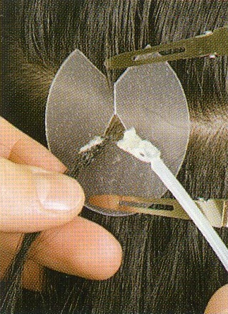 Пряди для наращивания готовятся заранее. Они скрепляются при помощи данного клея в пучки. Во время проведения процедуры мастер наносит на места скрепления прядей специальный активирующий раствор, который размягчает клей. Таким образом, появляется возможность присоединить донорские волосы к собственным. Пряди крепятся примерно в 1 см от корней и из клеевой основы вручную формируются маленькие плоские капсулы. Именно поэтому такой вид наращивания некоторые называют капсульным.