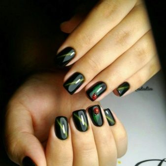 - Рисунок и «кошачий глаз» великолепно уживаются в одном дизайне, причем рисунок может быть абсолютно контрастным по цветовому решению и все-таки вписываться невероятно гармонично. Небольшая божья коровка на темно-зеленом покрытии – очень свежий нейл-арт.