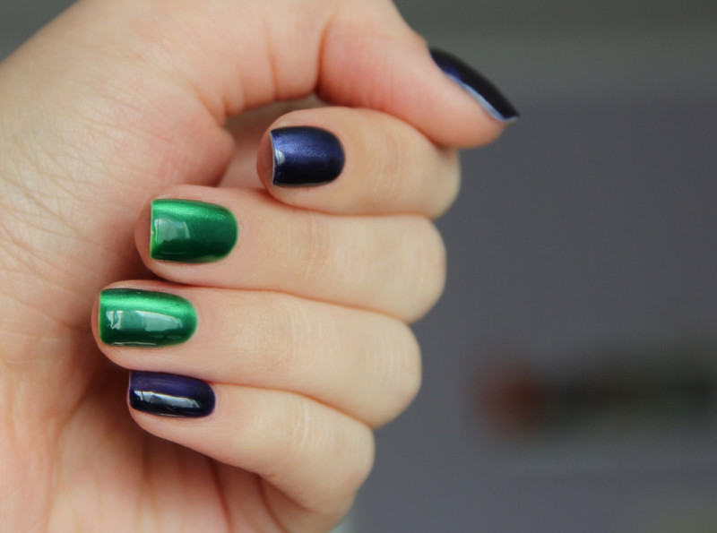 - Монохромное покрытие в модном оттенке малахита – отличный выбор для повседневного образа. Такой вариант элегантен и аристократичен, прямое доказательство того, что практически всегда «кошачий глаз» прекрасно чувствует себя без украшений.