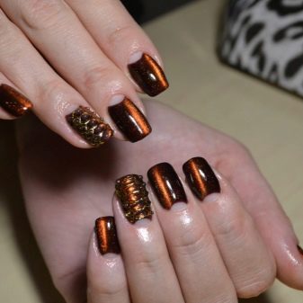 - Шоколадная и коричневая гаммы отлично сочетаются с золотым блеском кошачьих глаз. Обратный френч – оформление прозрачных лунок внесет оригинальную нотку в общую композицию. Акцентный ноготь можно выделить ненавязчивым узором в тон.