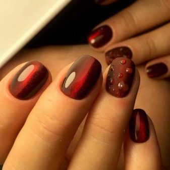 Палитра красного — это страсть, глубина и женственность. Глянцевый алый или винный маникюр долгое время находился на топовых позициях дизайна. Запросы современных модниц более взыскательны. Теперь мастера нейл арта предлагают украсить ноготки красным кошачьим глазом. Необязательно покрывать лаком всю пластину. Другие варианты: