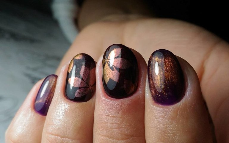 Бордо, винный, масала — все эти оттенки отлично подходят для уверенных в себе дам. Если хочется чего-то необычного, просто выбирайте магнитный лак. Это универсальный дизайн, который можно сочетать и с другими вариантами: