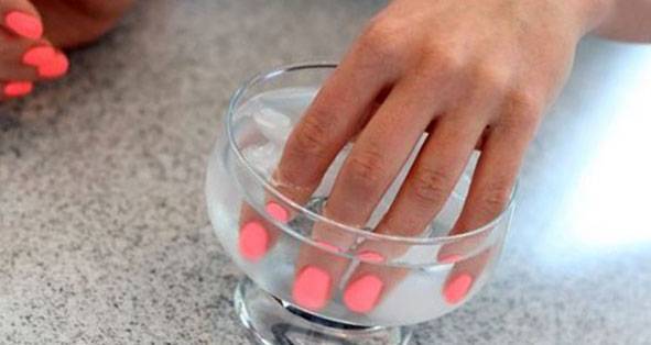 - Вода. Холодная, почти ледяная вода значительно сократит время высыхания покрытия. Наполнив ей небольшую миску, нужно просто на 5 минут погрузить руки, а затем извлечь их из воды и оставить маникюр высыхать естественным образом.