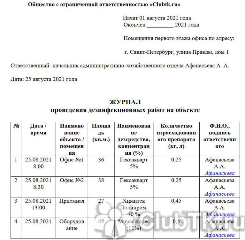 Это пример заполнения журнала генеральных уборок: