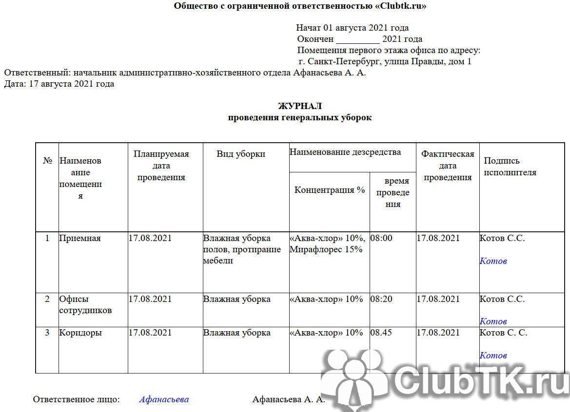 Это пример заполнения журнала генеральных уборок: