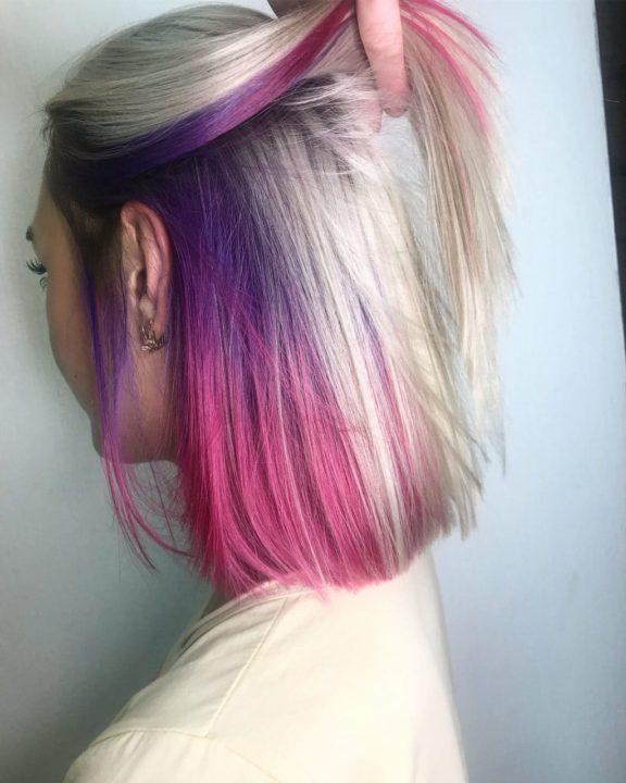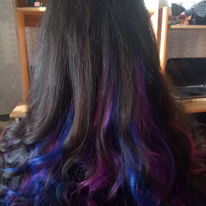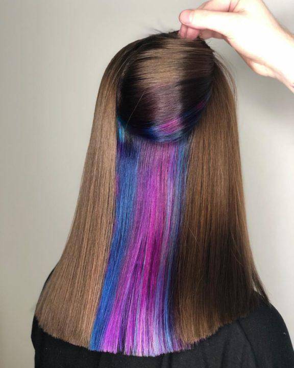 Техника скрытого окрашивания позволит вам наслаждаться любым ярким цветом, просто распустив волосы. И когда подует ветер, ваши волосы будут весьма красиво развиваться и переливаться яркими оттенками.