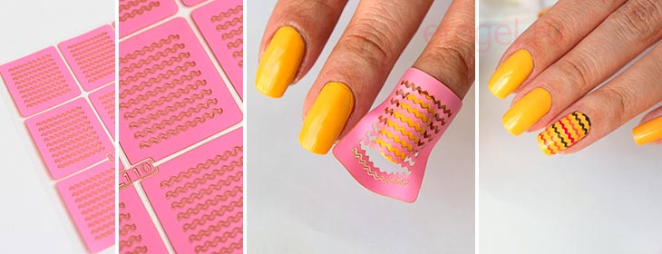 Для создания несложных рисунков на ногтях, например, цветочков, молний, мотыльков, звездочек, фигур, зигзагов и пр. применяются клейкие заготовки с соответствующими узорами и рисунками, вырезанными в клейком шаблоне. Такие трафареты для дизайна ногтей размещаются на тонкой бумажной пленочке, снимающейся перед приклеиванием шаблона.