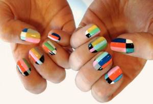Возьмите лаки разных оттенков и нанесите их продольными полосками на ногтевую пластину. Из скотча нарежьте несколько узких полосок и произвольно наклейте их на ноготь. Затем покройте его однотонным, желательно матовым, лаком.