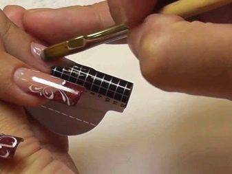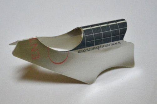 — Форма шаблона вырезается по форме натуральной ногтевой пластины, после чего устанавливается на ноготь без малейшего зазора, в противном случае туда может забиться гель, что отрицательно повлияет на качество работы.