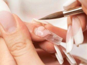 Типса приклеивается специальным клеем и дополнительно фиксируется гелем. Идеально подходит для мягких ногтей, где кончик ногтя не зарастает и не теряет форму. Также можно использовать акрил. Это особый порошковый материал, смешанный со специальным раствором. Этот модельный состав очень быстро застывает, поэтому использовать его нужно очень быстро. Такое под силу только специалисту.