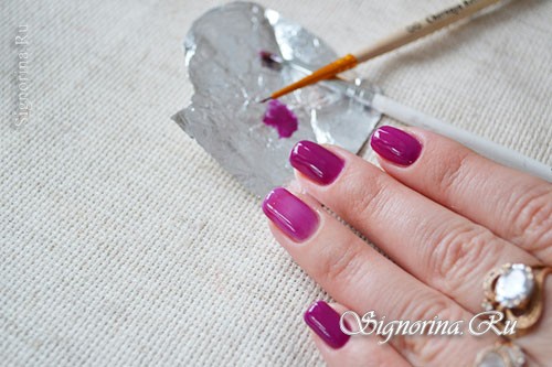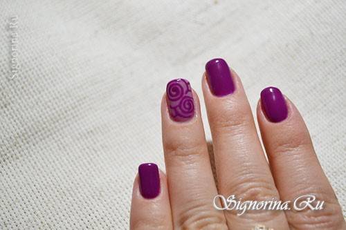 8) Тонкой кисточкой рисуем завитушки на безымянном пальце. Я рисую таким же цветом, что и красила ногти.