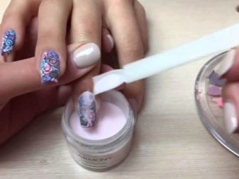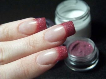 Отличной заменой пудре-меланж является акриловая. Это полимерный порошок, используемый при наращивании ногтей. Она может быть цветной или прозрачной, с различными добавками. Качество и дизайн от этого не ухудшатся. Прочность также высокая. Во время нанесения на поверхность ногтя пудра перемешивается с мономером и становится твердой. Этот вариант часто используют для декоративного оформления ногтей, так легче всего сформировать различные узоры, сделать ровное покрытие. Есть несколько вариантов технологий маникюров с акриловой пудрой: