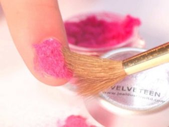 Главный секрет дизайна ногтей с бархатом — это применение специальной пудры для покрытия ногтей, по внешним характеристикам которая очень похожа на всем известные блёстки, отличаясь при этом более приятной структурой. По сути, эта пудра напоминает цветную пыль, присыпав которой невысохший лак, можно получить покрытие, похожее на дорогой материал – бархат.