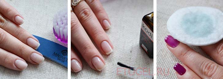 - Чистый тампон смачивается в небольшом количестве ацетона и обрабатывается каждый ноготь — проводится обезжиривание.