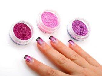 Достаточно просто и удобно пользоваться пудрой мелкой фракции, с её помощью маникюр сможет сделать даже дилетант в нейл-арте. Даже если профессиональный материал купить не удалось, можно в создании оригинального покрытия использовать пудру для скрапбукинга (которая продаётся в любом магазине рукоделия).
