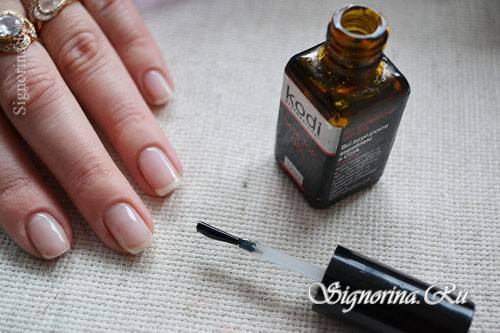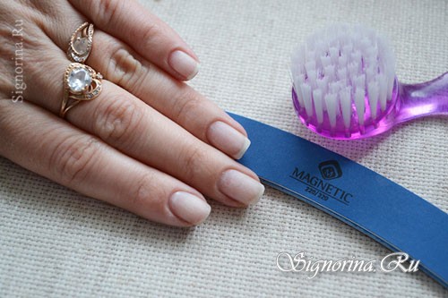 - Сначала делается простой маникюр — обрабатывается кутикула, подрезаются и запиливаются ноготки.